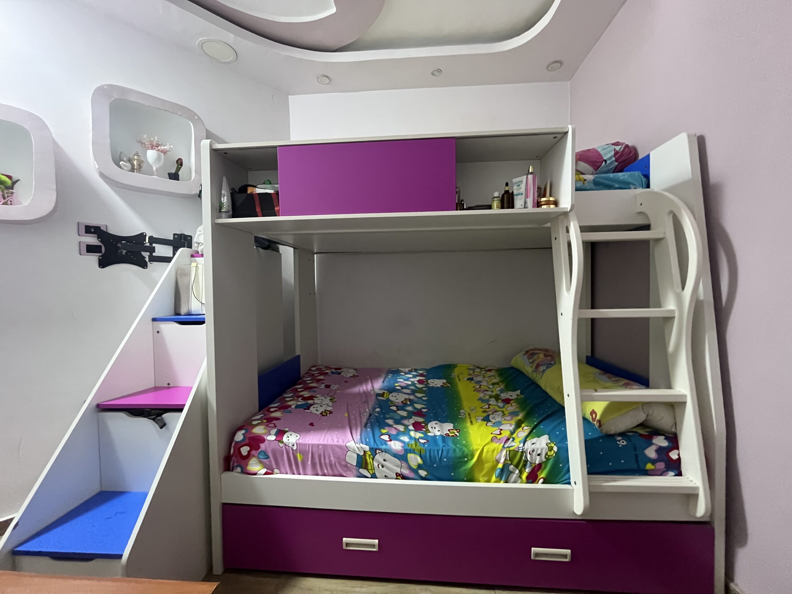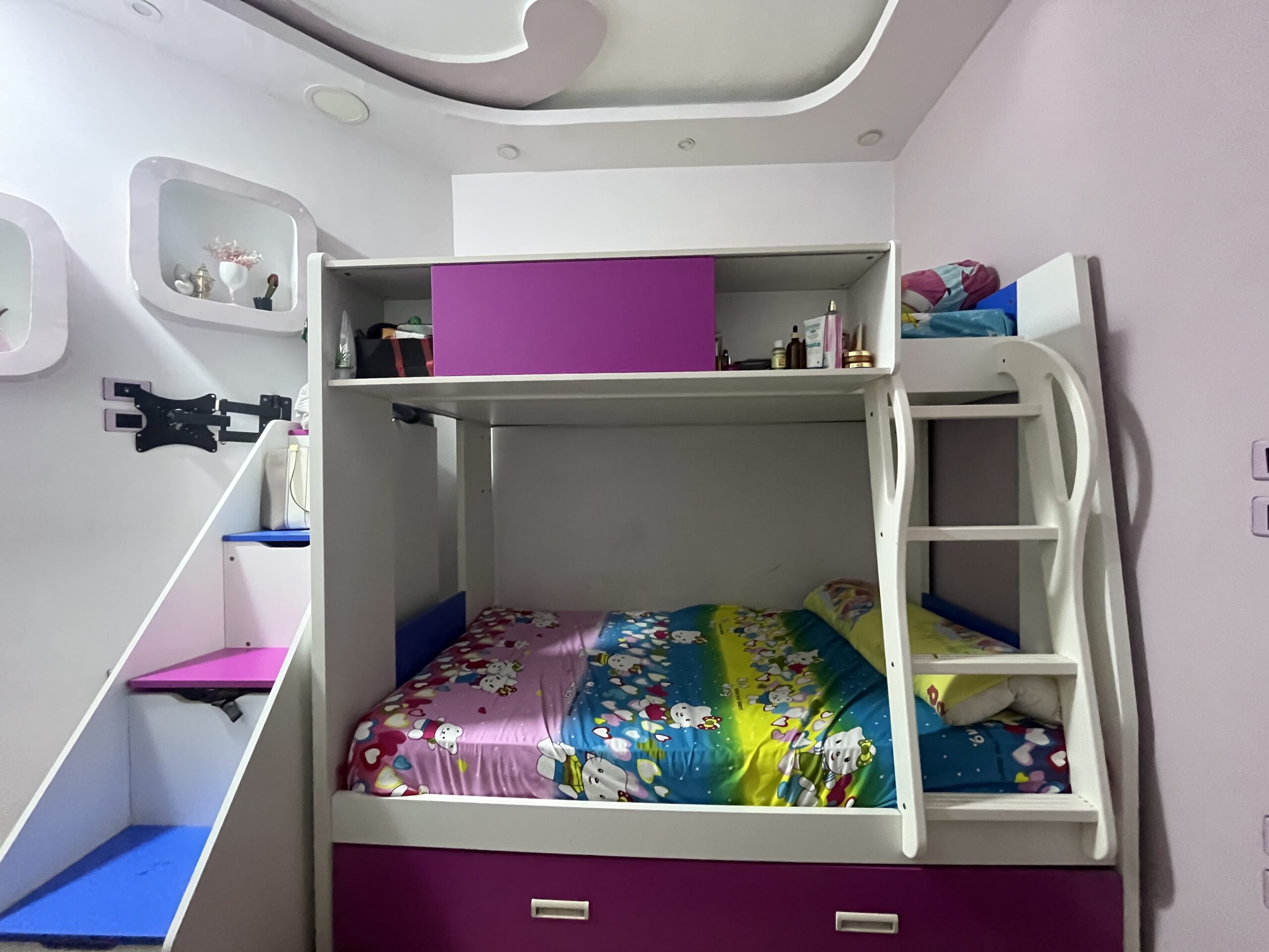غرفة أطفال كاملة للبيع – سرير بدورين + مكتب + دولاب 🛏️ الحالة: ممتازة جدًا، مش محتاجين أي مصاريف تفاصيل الغرفة: سرير بدورين: لون أبيض × موڤ، السرير اللي تحت واسع، فيه درج تخزين كبير، ووحدة تخزين فوق، والسلم ثابت وآمن مكتب خشب: شكله شيك ومتين جدًا دول...