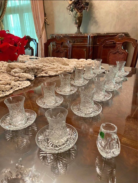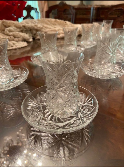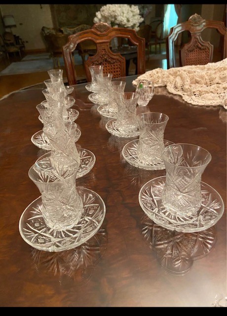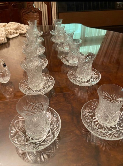 A lovely bohemian crystal tea set, 12 cups with their stands and a separate pot for milk, with its tag. New and beautiful, very elegant