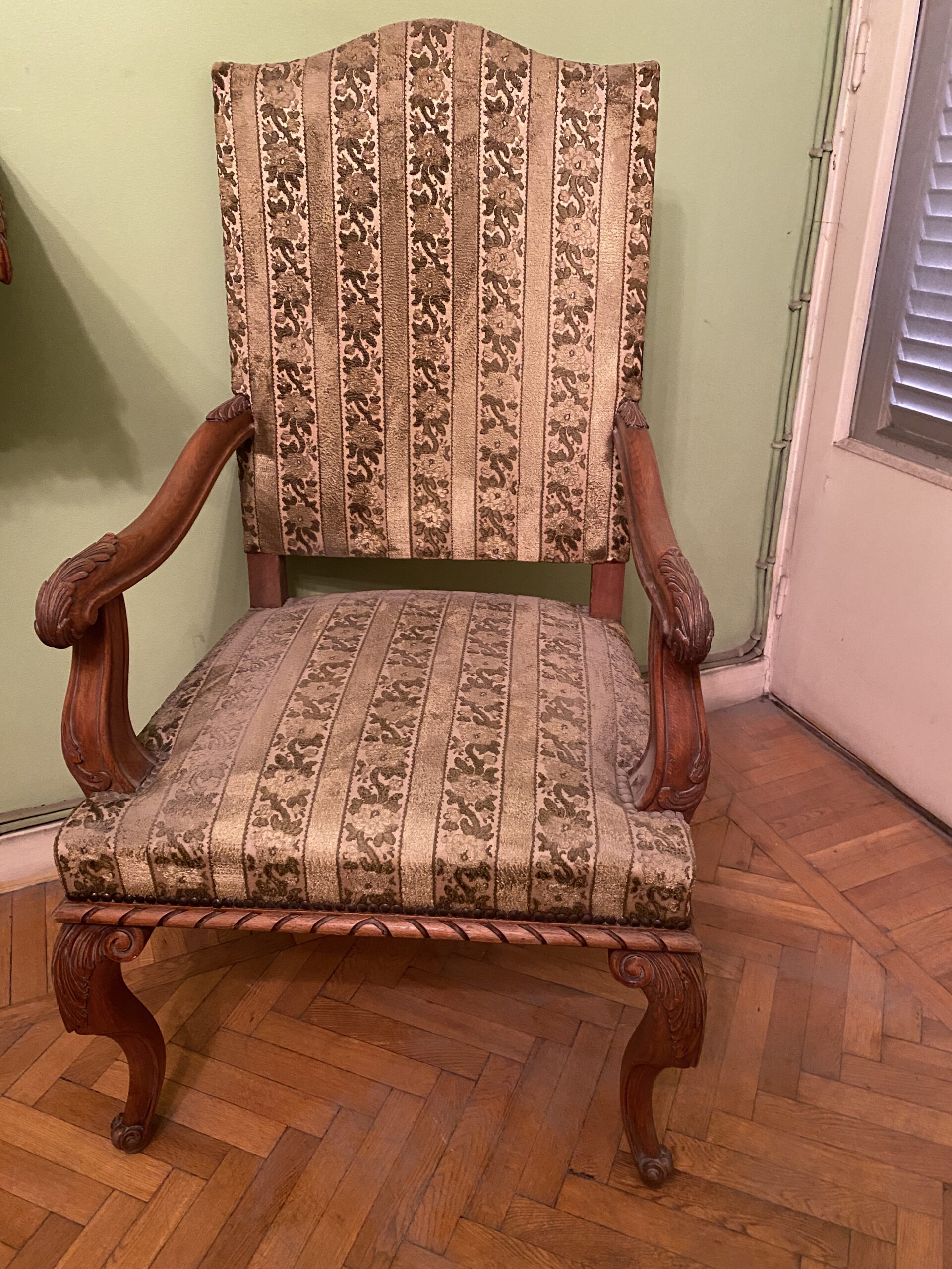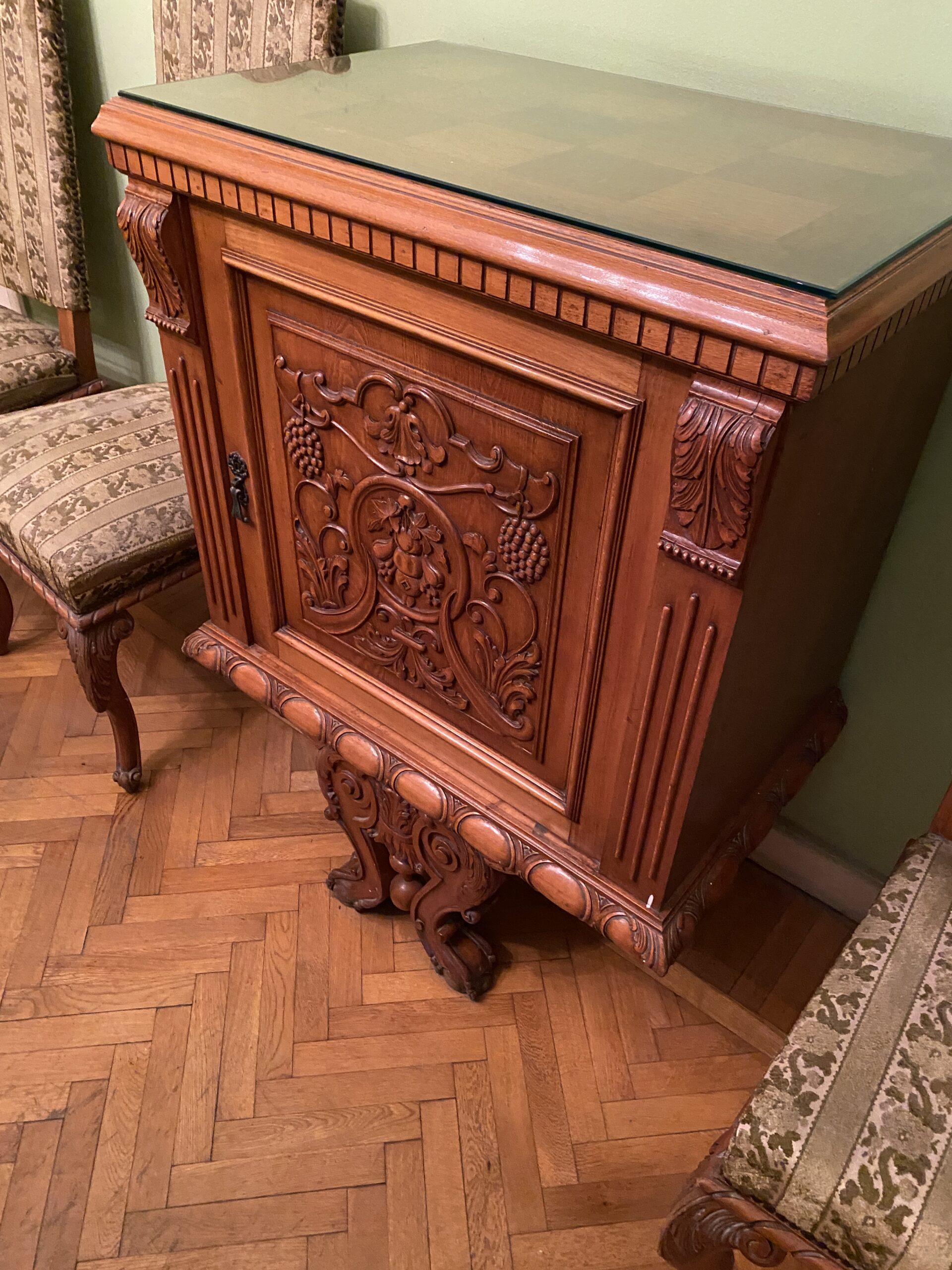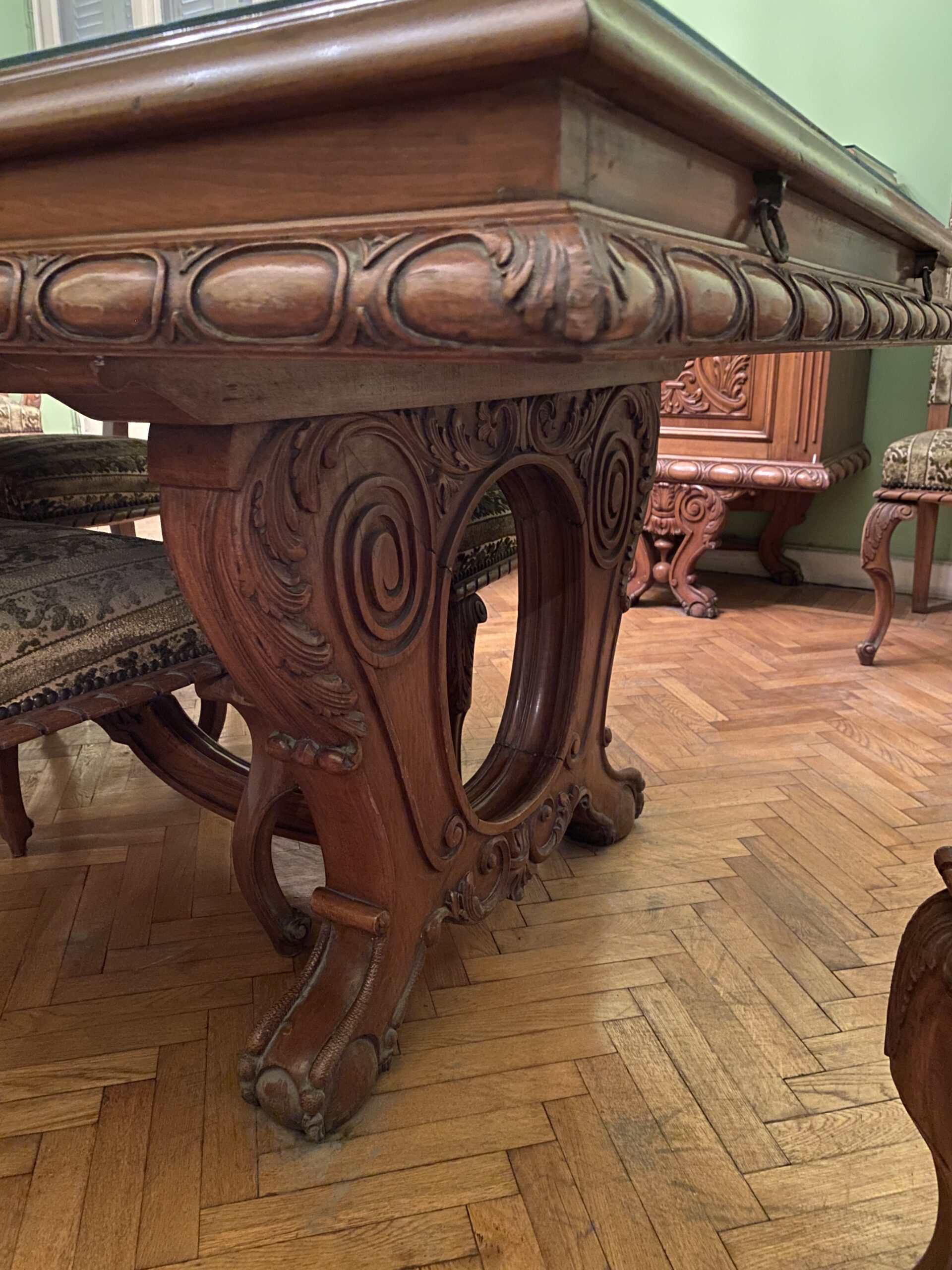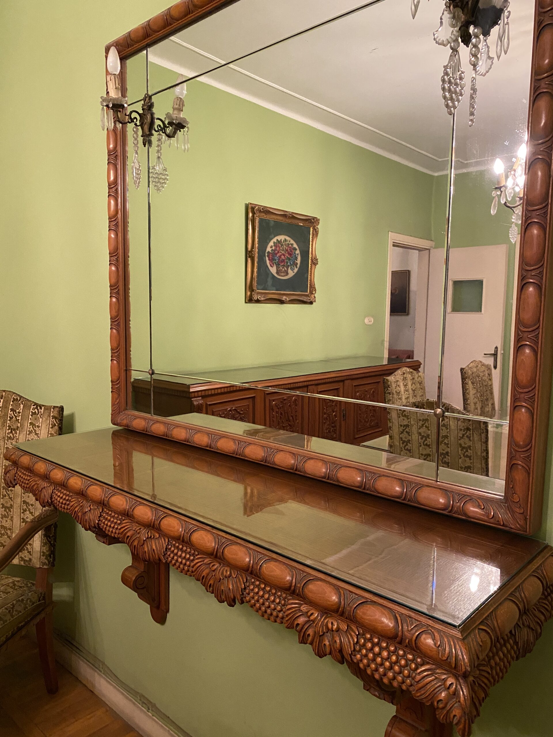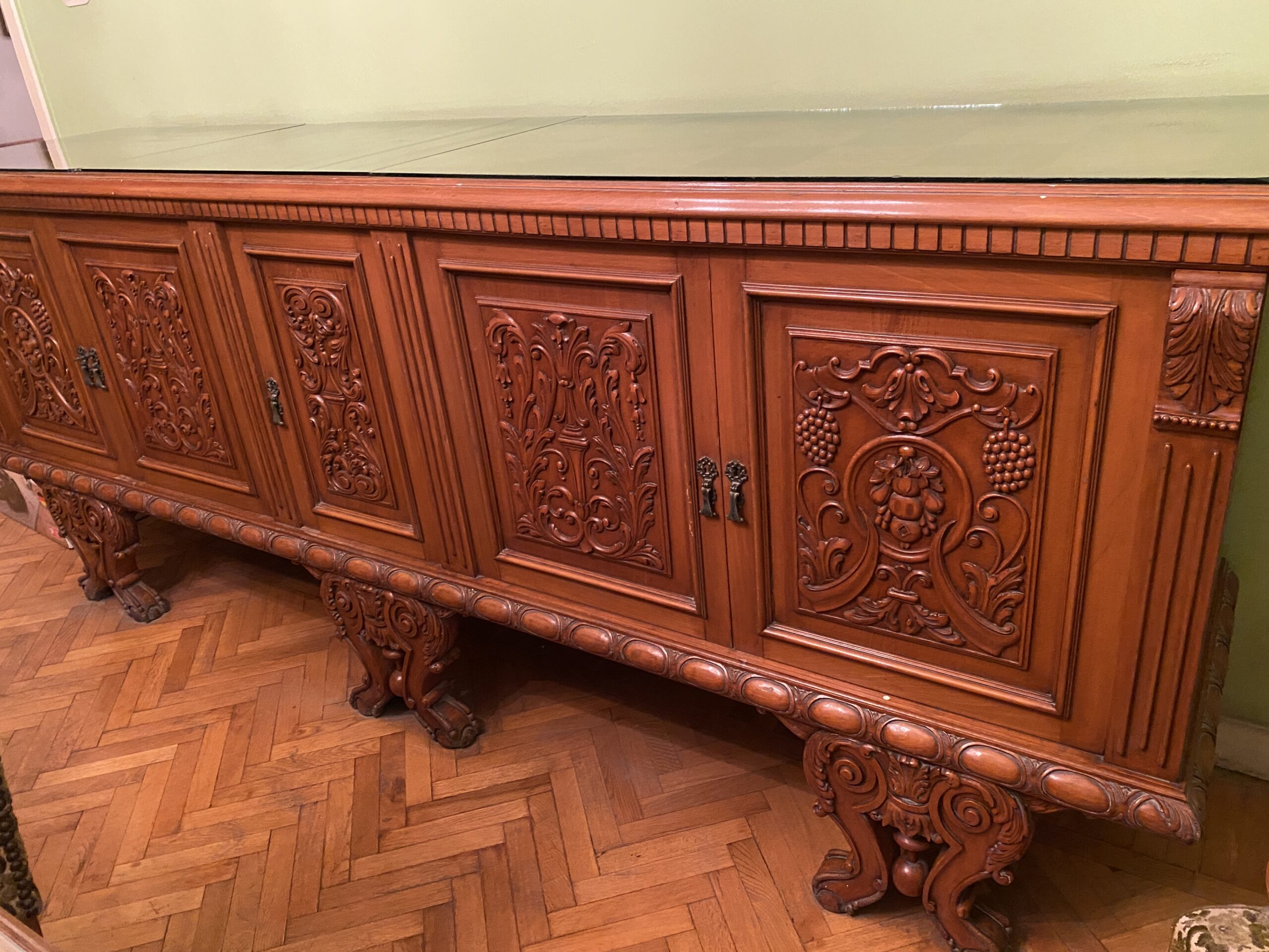 Dining room – wood massif- hand carved Large dining table with extensions to reach 3.5 meters 12 chairs including two armed chairs Consol wall mounted with large mirror 2.5 meters buffet (1) 1 small buffet (1) 60 cm