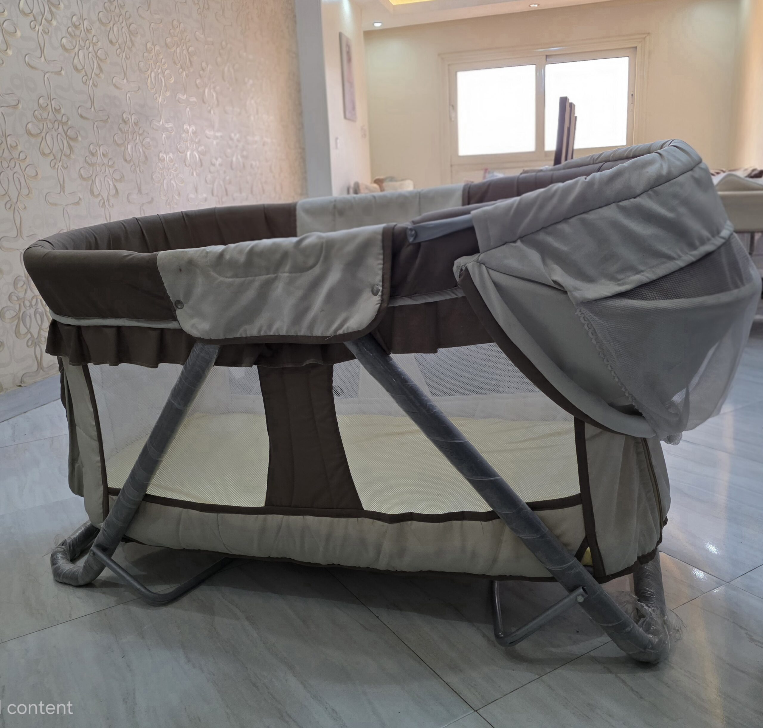 سرير بيبى معدنى بناموسية بالمرتبة، ٢ مستوى، طول ١٢٠ سم* عرض ٥٥ سم، قابل للطى لم يستخدم 01205359057